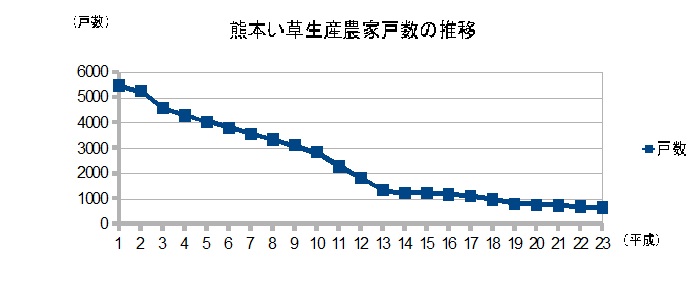 1反(10a)当たり600枚から350-400枚と、昭和の頃の約60-65%の生産量で同じ収入を上げなければいけない構造となりましたが、平成に入ってからは住宅構造等の変化による畳表の需要減と中国産との競合の中で再生産価格に届かず、生産農家戸数は年々減少してきました<図3>。参考まで農家戸数は平成元年を100%とすると平成23年度で11%となっています。