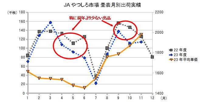 平成23年の1月頃は、22年産が不作だったために、早くから「今年は3月で原料となる"い草"が切れる農家が出てくる」と言われていました。<図1>のグラフは平成22~23年のJA市場における出品の推移を比較したものですが、実際に23年4~7月と9~10月における出品枚数が前年比20~30%少なくなっています。この大きく落ち込んだ出品時期のあとに品薄状態となり、大きな相場高騰が起きたように思われます。