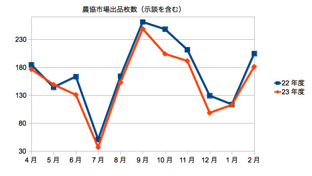 昨年4月からの市場では前年より1割近く少ない出品だった