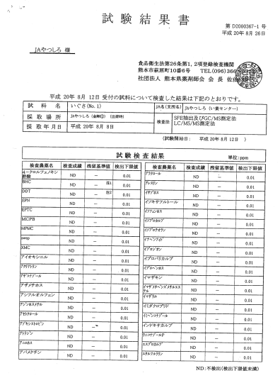 A:弊社ホームページのダウンロードのページの一番下に4年分の「残留農薬試験結果書」があります。